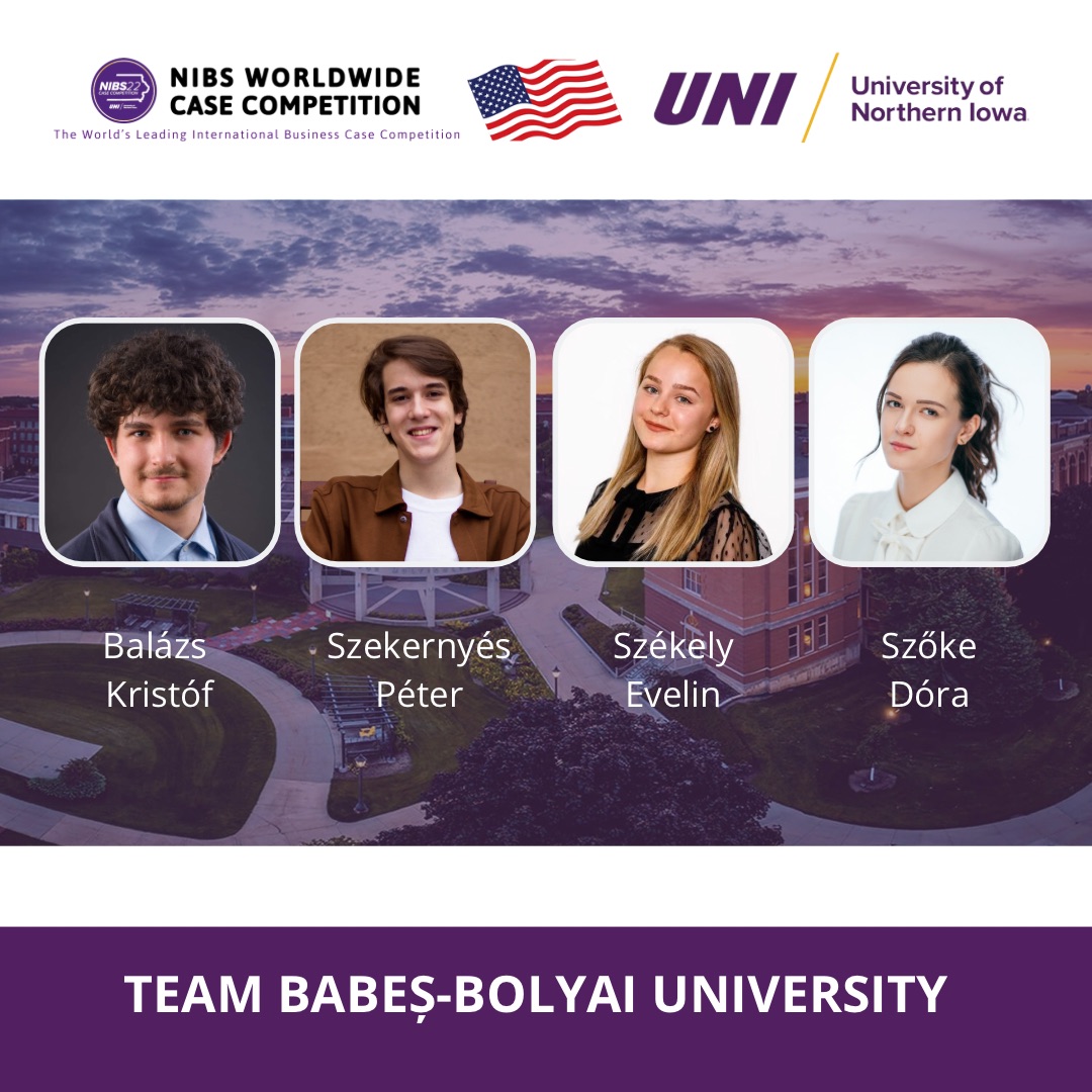 2022. március 6-11. között az egyesült államokbeli University of Northern Iowa által került megszervezésre a NIBS Worldwide Case Competition (https://nibscasecompetition.org/), amely a NIBS (Network of International Business Schools) vezető, világszinten megszervezett gazdasági esettanulmány versenye. A verseny 26 éves történetében idén először a Babeș-Bolyai Tudományegyetem (BBTE) Közgazdaság- és Gazdálkodástudományi Karának négyfős GTK-s diákcsapata is bejutott a döntő fordulóba. Bár a kolozsvári csapat, írországi, hollandiai és dániai egyetemek csapataival versenyezve, ezúttal nem jutott tovább a csoportjából, kiváló teljesítményükre jellemző, hogy a teljes verseny legjobb prezentációjáért járó egyéni díjat a BBTE csapatának egy tagja, Szőke Dóra nyerte el.