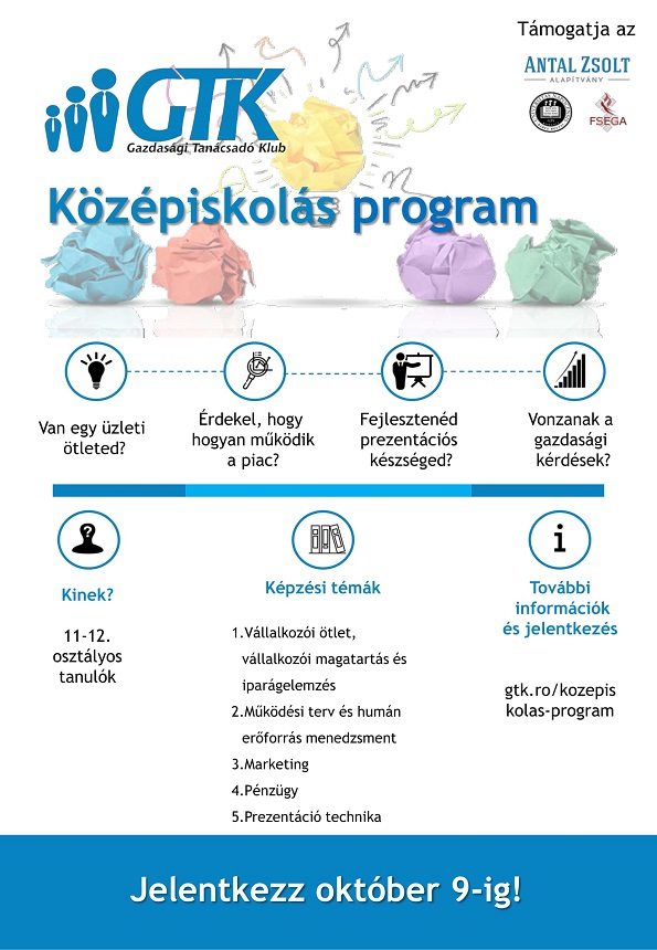 A GTK Középiskolás Programjának célja, hogy az üzleti tervezés oktatásán keresztül olyan gyakorlatias gazdasági tudást adjon át, amely kiegészíti a középiskola padjaiban elsajátított elméleti, közgazdaságtani és vállalkozástani ismereteket. A program a diákok jövőbeni szakmai profiljától függetlenül biztosítja az üzleti logika elsajátításához szükséges alapokat, amelyek hozzásegítik a résztvevőket jövőbeni üzleti (vagy akár nem üzleti jellegű) céljaik eléréséhez.