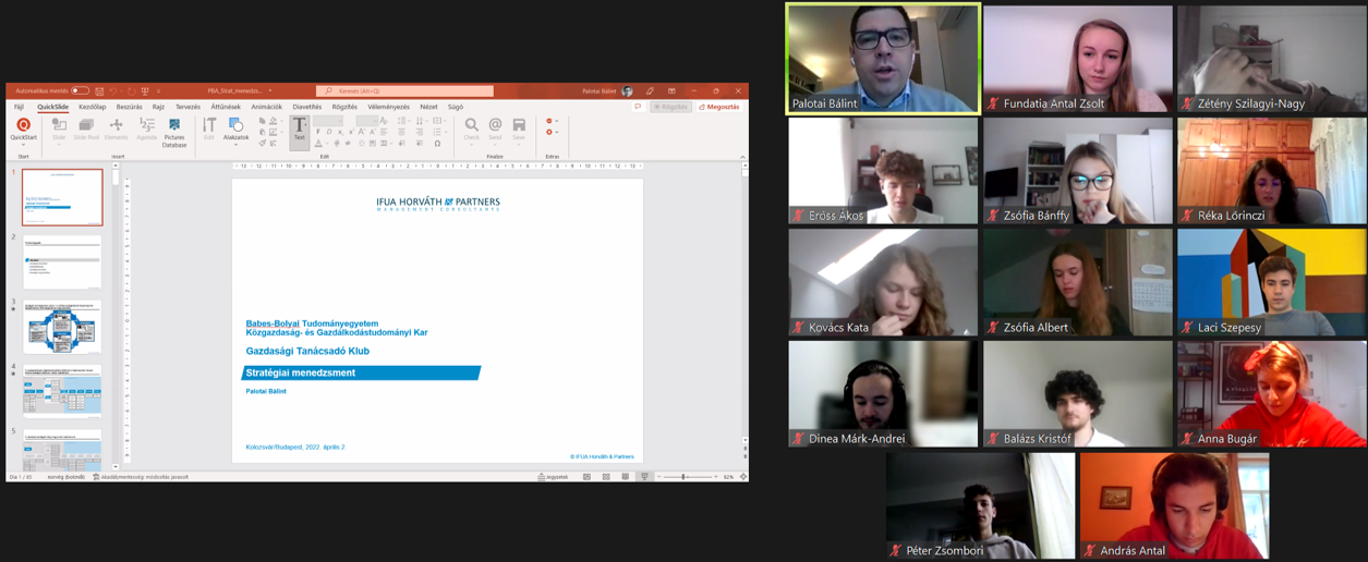 Április 2-án a Gazdasági Tanácsadó Klub első éves diákjainak lehetősége nyílt részt venni egy 9 órás stratégiai menedzsment képzésen. Az egész napos tréninget Palotai Bálint, a magyarországi IFUA Horváth & Partners vállalat partnere tartotta.