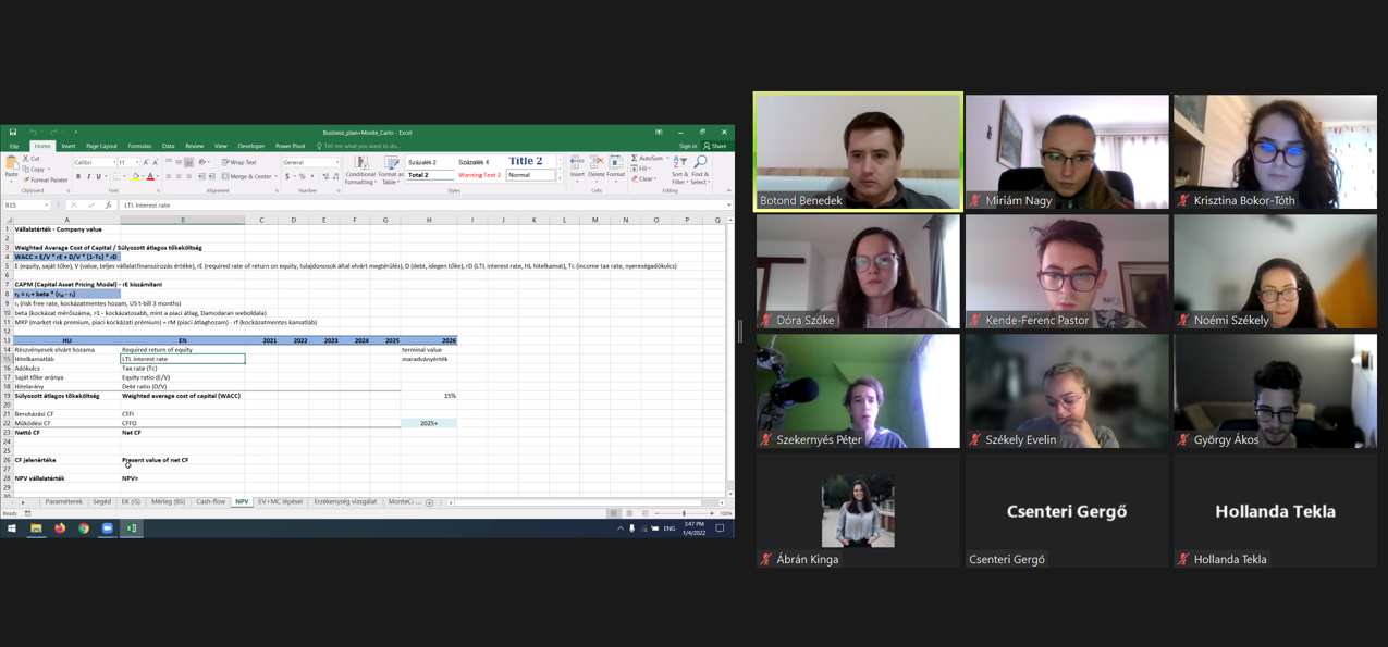 On the 4th January , 2022, the second- and third-year GTK members participated in an advanced financial training held by Benedek Botond, lecturer at the Babeș-Bolyai University, Faculty of Economics and Business Administration. During the course, students analyzed the financial position and present value of a real startup in the hospitality industry. With a sensitivity study, a pessimistic and optimistic scenario was considered, in addition to the baseline scenario, with varying indicators.