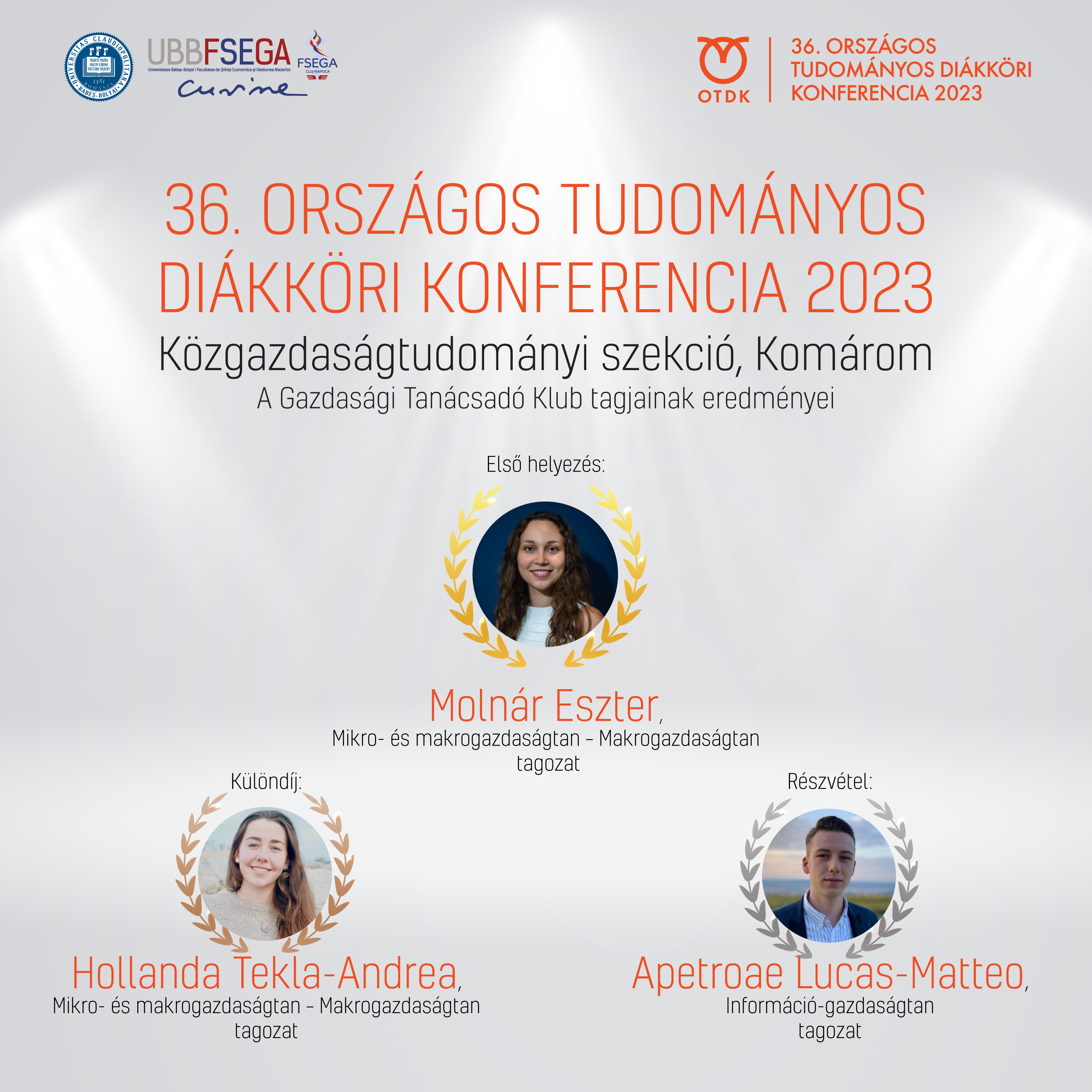 The 36th National Conference of Scientific Students, Economics section was held in Komárom, Slovakia, between 20-22 April 2023, at the Selye János University, with 518 papers presented in 72 sessions. Our alumni members presented 3 papers, of which 2 papers were awarded prizes, as follows: