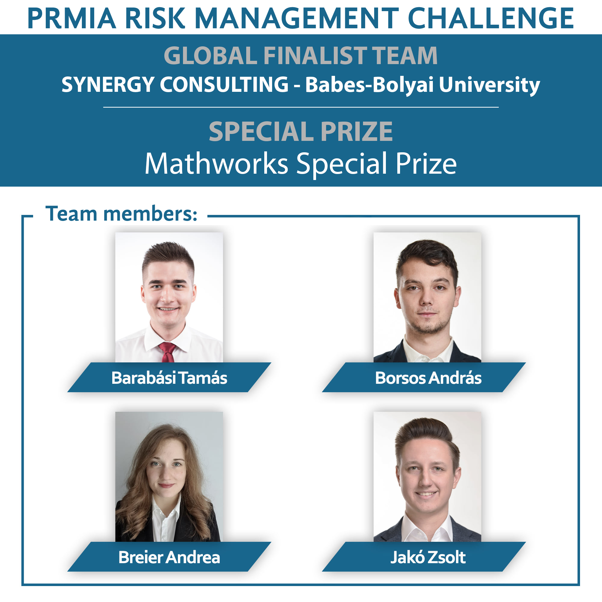 Echipa UBB, Synergy Consulting a câștigat premiul special “Best interactive dashboard” pentru raportul de management de risc și performanță creat în MATLAB, acest premiu fiind oferit de Mathworks. Pe de altă parte, participanții echipei UBB au primit PRMIA Sustaining Membership pentru o perioadă de un an pentru participare la finala internațională.